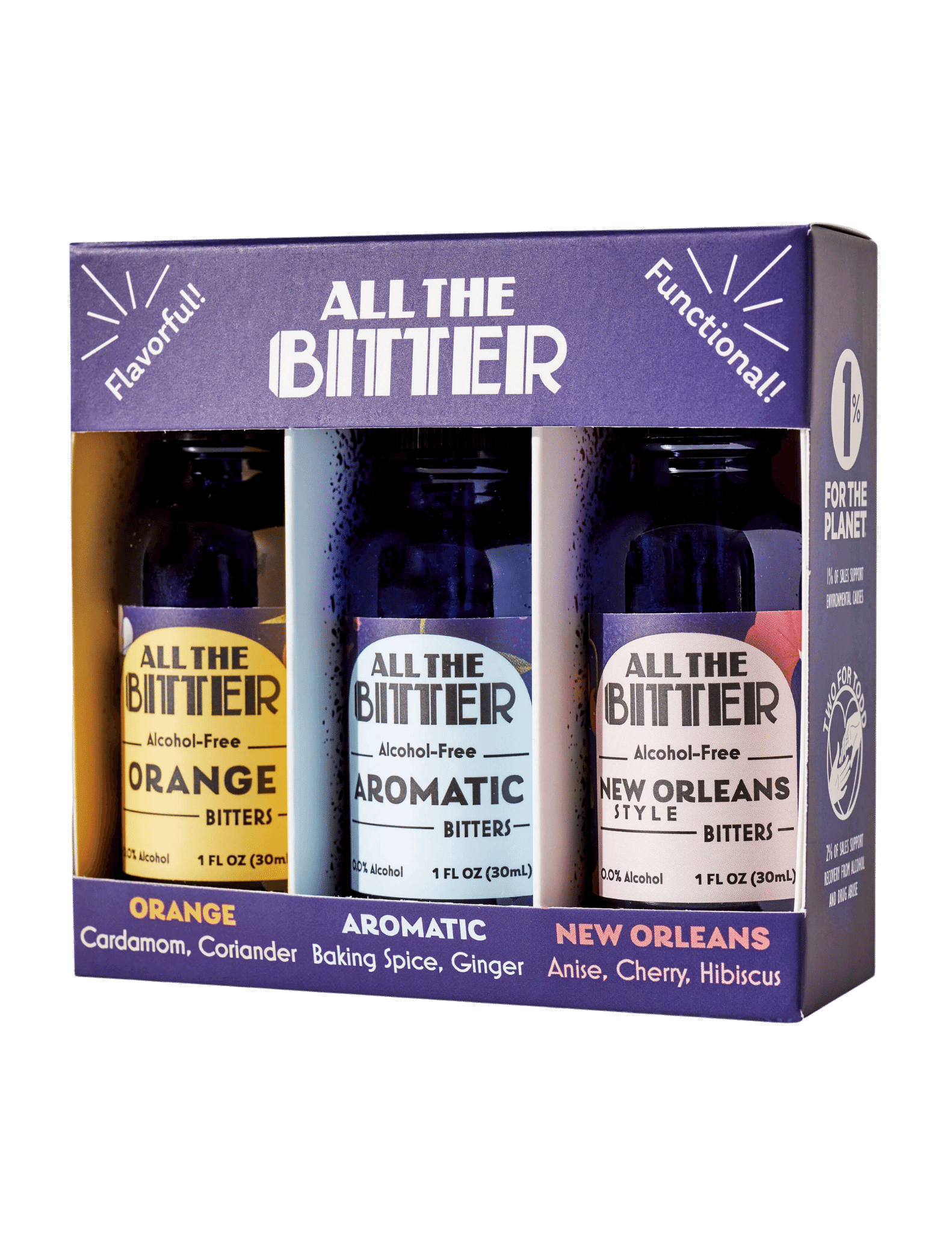 Bring flavor and functional benefit with you wherever you go! Makes a great gift and is both airplane and purse friendly, too. Includes 3 of our award-winning alcohol-free bitters, perfect for making cocktails or simply mixing with soda water: Aromatic, Orange, and New Orleans. - San Francisco World Spirits Competition 2022: Silver and Bronze Medals - Los Angeles Spirit Awards 2022: Gold and Silver Medals 0.0% ABV | 3x 1oz (30 mL) bottles