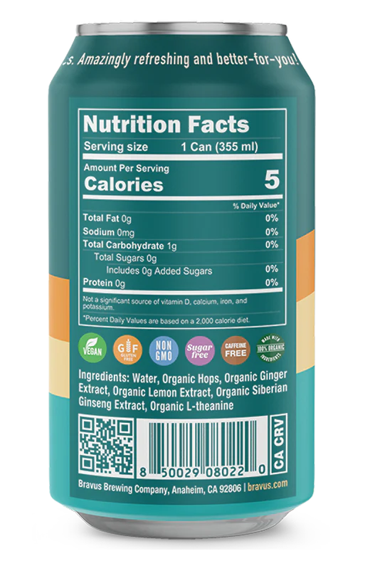 Ingredients: carbonated water, hops, organic lemon extract, organic ginger extract, organic Siberian ginseng extract, organic green tea extract