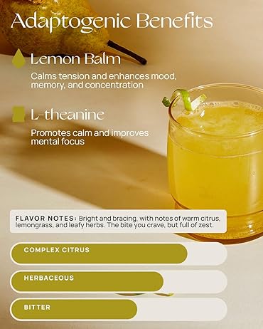 Bright and bracing, Golden Hour bursts with sunny citrus notes of lemon and bergamot, perfectly balanced by earthy hops, rosemary, and bay leaf. With a blend of adaptogens like reishi mushroom, lion's mane, and L-theanine, this refreshing spritz promotes relaxation and mental clarity in every sip.