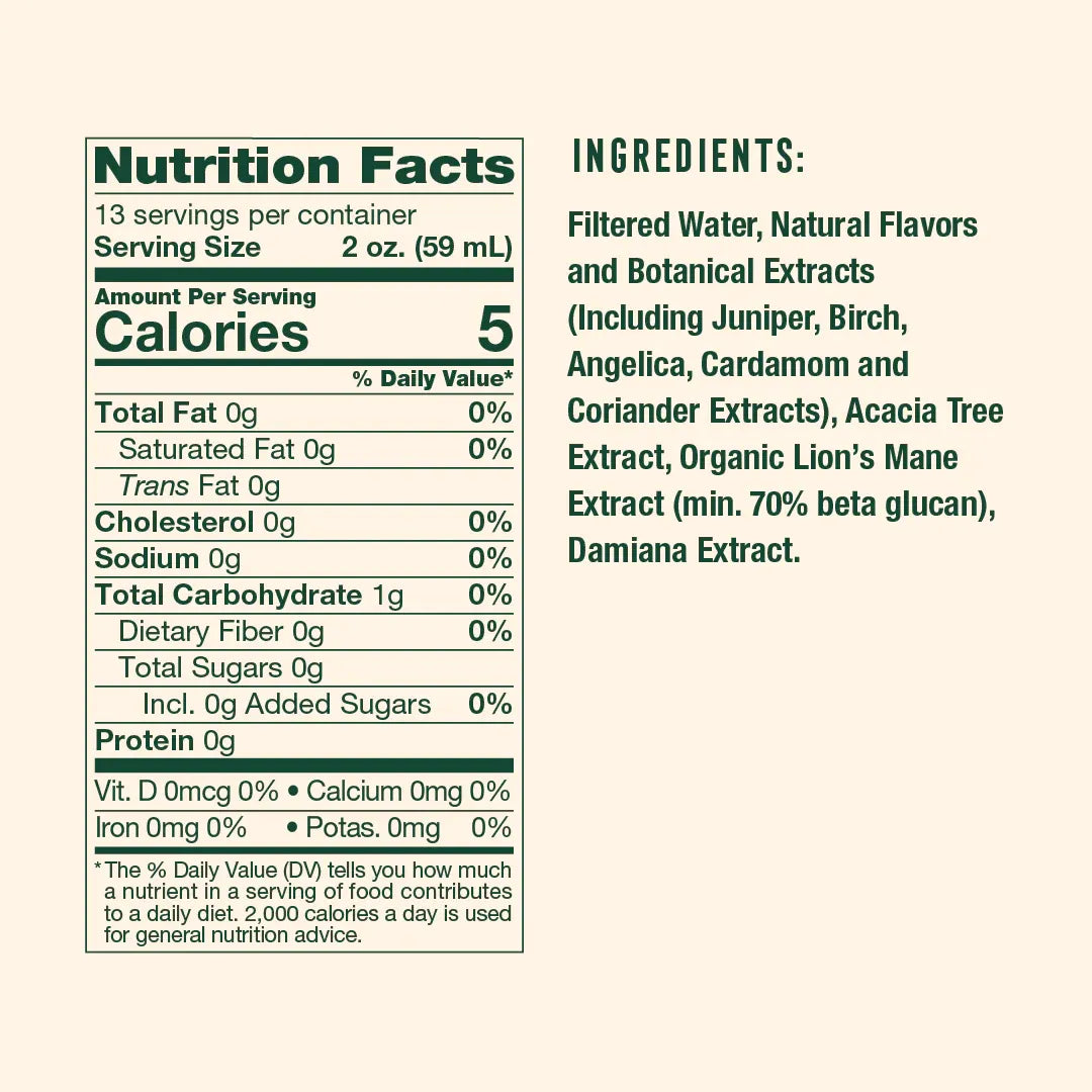 INGREDIENTS: Filtered Water, Natural Flavors and Botanical Extracts (Including Juniper, Birch, Angelica, Cardamom and Coriander Extracts), Acacia Tree Extract, Organic Lion's Mane Extract (min. 70% beta glucan), Damiana Extract