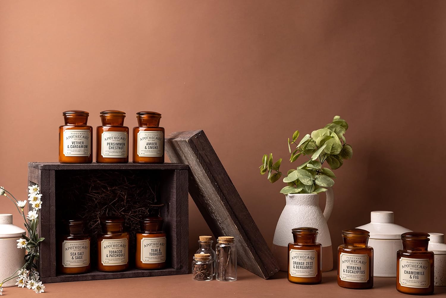 Old-world apothecary bottles are filled with the perfect remedy of fragrance in this vintage-inspired collection. These amber glass vessels are filled with luxurious fragrance ready to elevate the tone in your home!